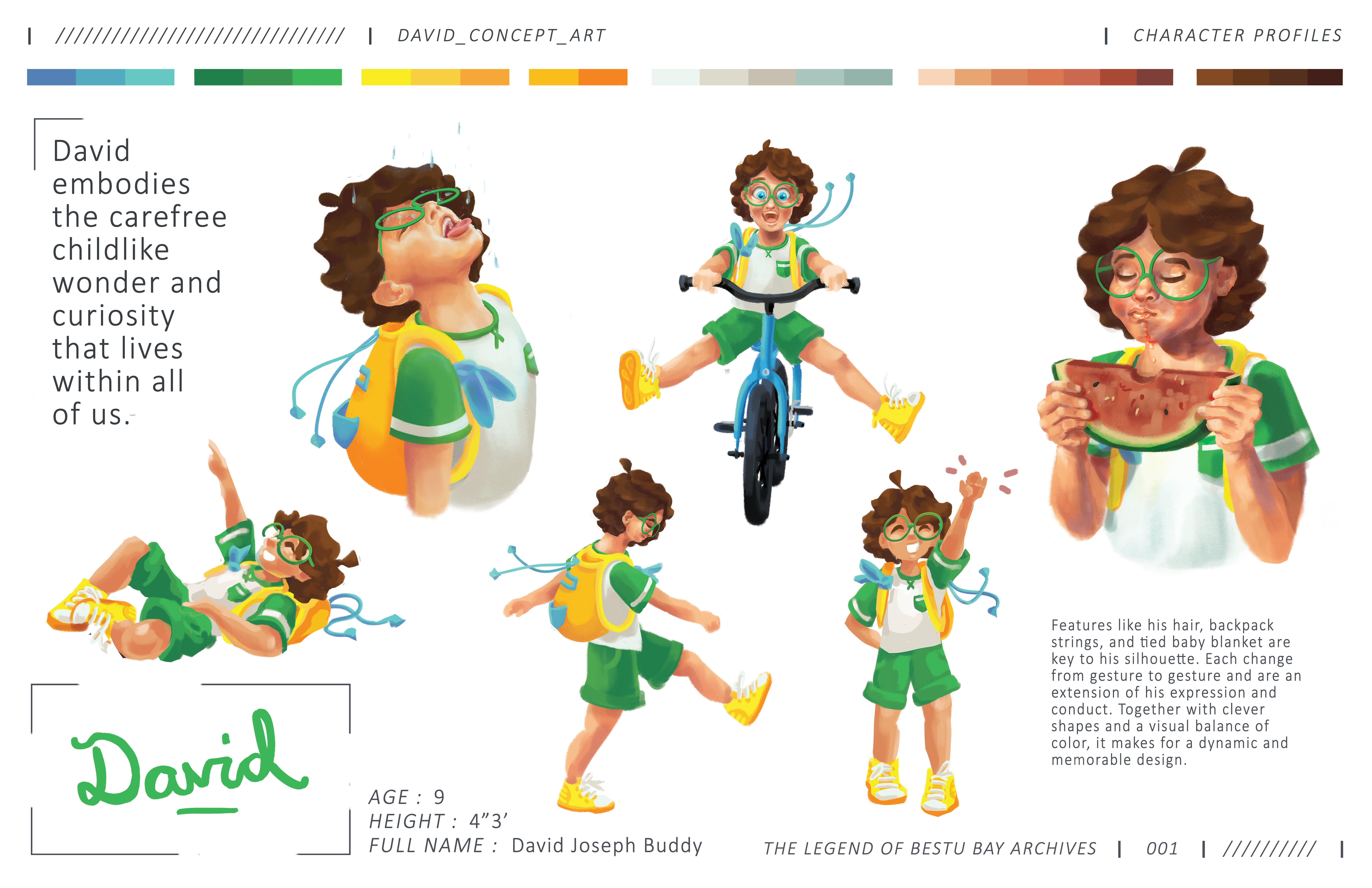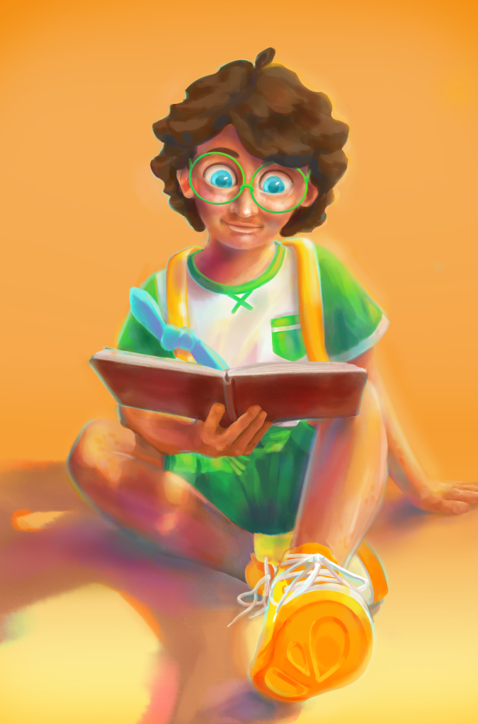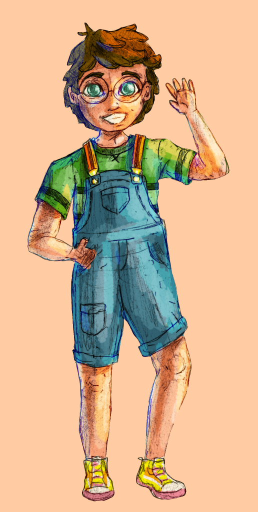 The artworks in the gallery to the left display the evolution of David’s character design over that past three years! To the right I’ve also complied sketches that show my experimentation process. All of the old stuff is mildly embarrassing to share, but I think it’s important to realize that all artists start somewhere, progress isn’t always linear, and that great art doesn’t happen overnight. Over time you’ll notice the variation of style as I became more confident with his design and digital art. My favorite part of seeing all these images together is comparing the bits and pieces that change over time yet in some ways stay the same. I’ve always had this love of vibrant lighting, brilliant colors, big expressive eyes, lineless drawings, and dynamic visual storytelling. It was only a matter of time and practice before I would have the skills to reach that goal! The character spread above this section depicts his final form.