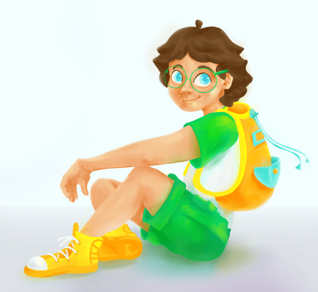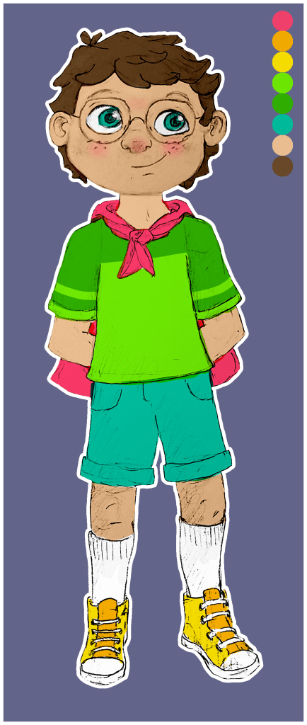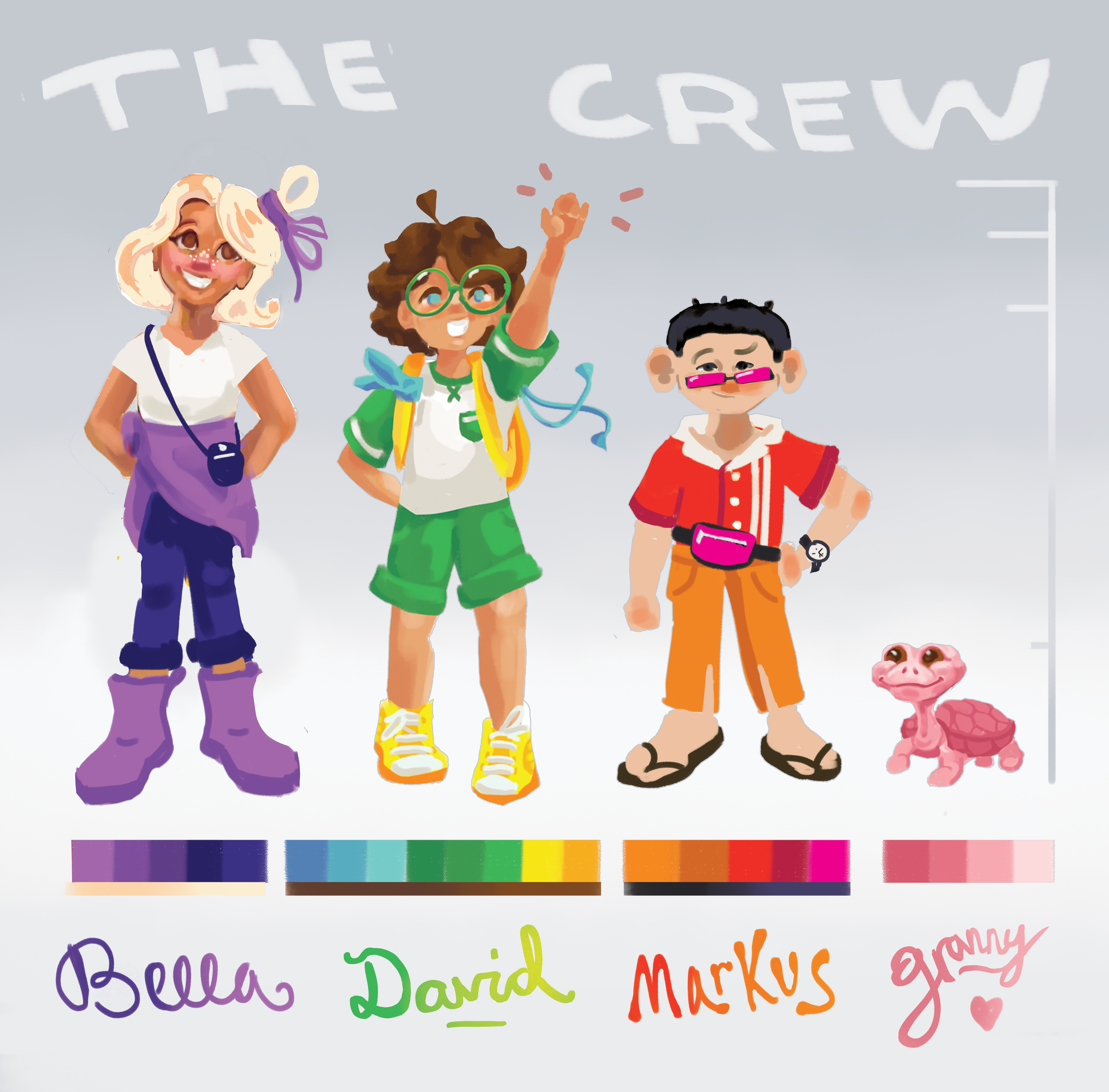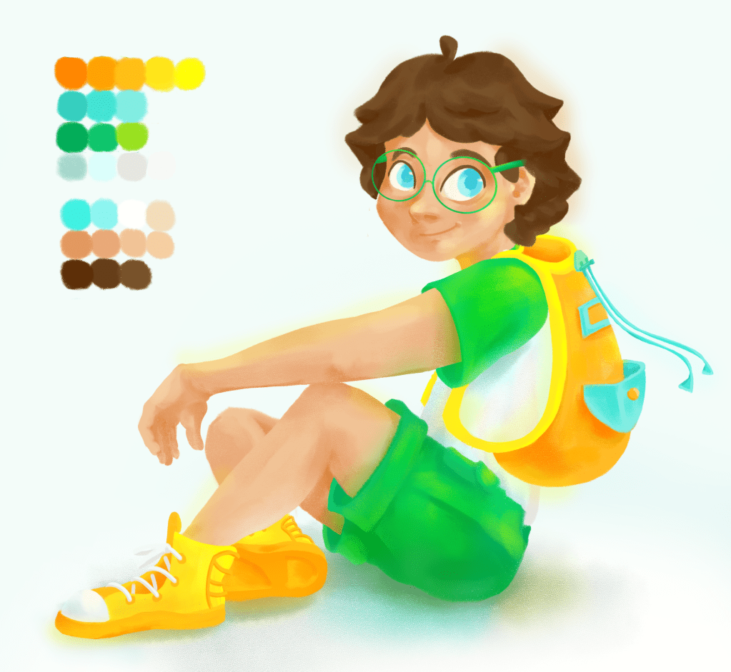 This is the crew! …or backpack gang? Traveling trio? Comment your name ideas below! Notice how they all have all distinct and different features, yet put in the same picture together, they are all somehow cohesive. How do I do this? First: take note of all attributes from the colors and shapes of the hair, skin, facial structure, and eyes… to the type of shirt, length/style of pants, type of shoes, and type of carrying bag(my real life brother David suggested this. I LOVED that idea, for it’s another opportunity to show their unique characteristics). Point being, NOTHING is ever the same! Second: fun fact, my inspiration for when creating this ‘gang’ of characters come from some of my favorite TV shows of all time: Scooby Doo and the MLP: Friendship is Magic. In both shows, although the main crew of characters all have distinct and different features (such as I listed above), what brings them together is that all their designs as a whole include every color of the rainbow! Individually, everyone has their own distinct colors… often two that are analogous or complementary on the color wheel. Lastly: All colors repeat at least twice whether that be in their own design or it appearing on another characters. Such as Shaggy’s shirt and Daphnie’s scarf, Velma’s shirt and Fred’s scarf. Or Pinkie Pie’s skin is the same color as Fluttershy’s hair, Fluttershy’s skin is Apple Jack’s hair. AH! SO COOL! Go look up and find all the color doubles for yourself, this is just scratching the surface! Learn from the greats, study them, and your work will be better too! For my work, I did the rainbow thing and color doubles rule within the individual characters. Can you spot it?