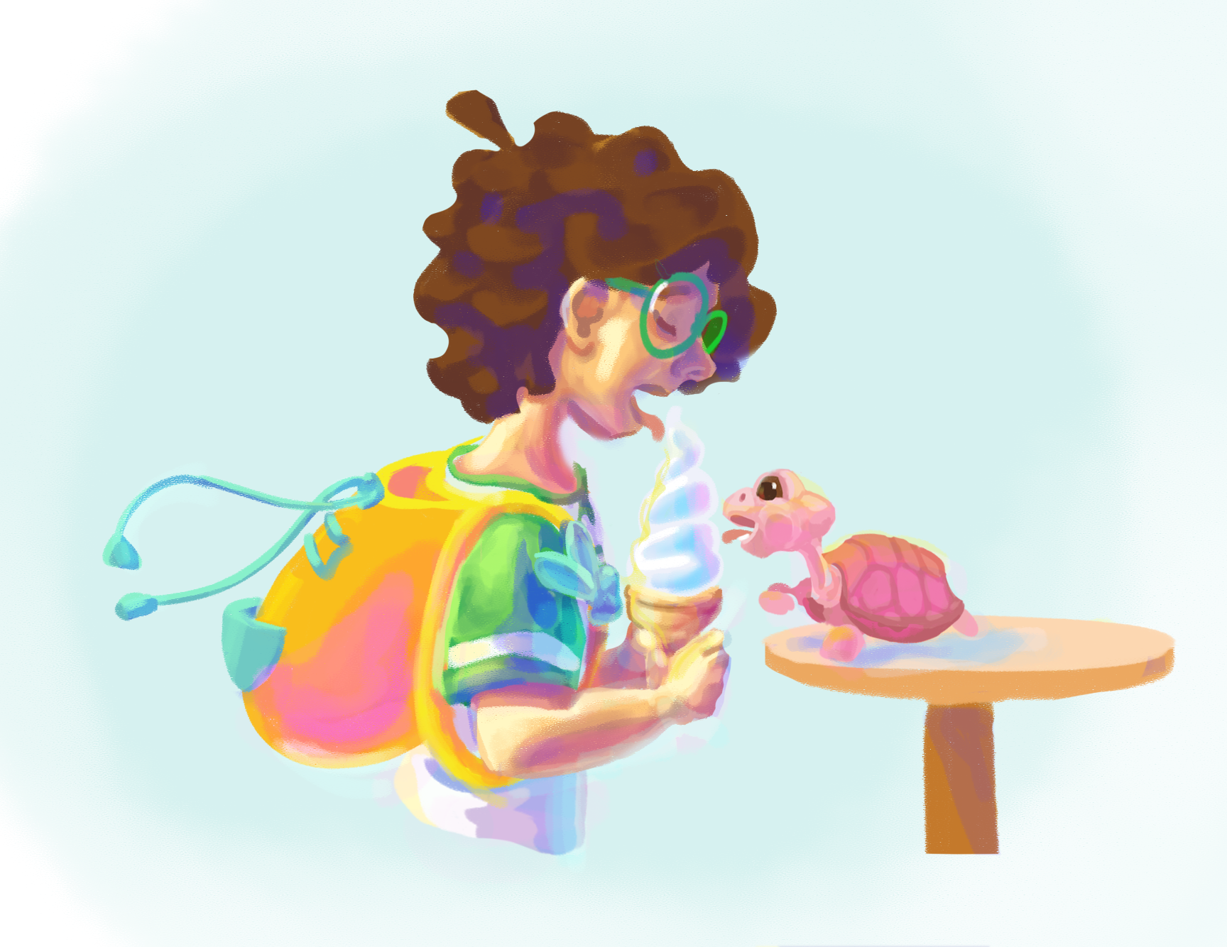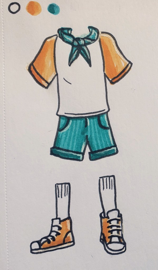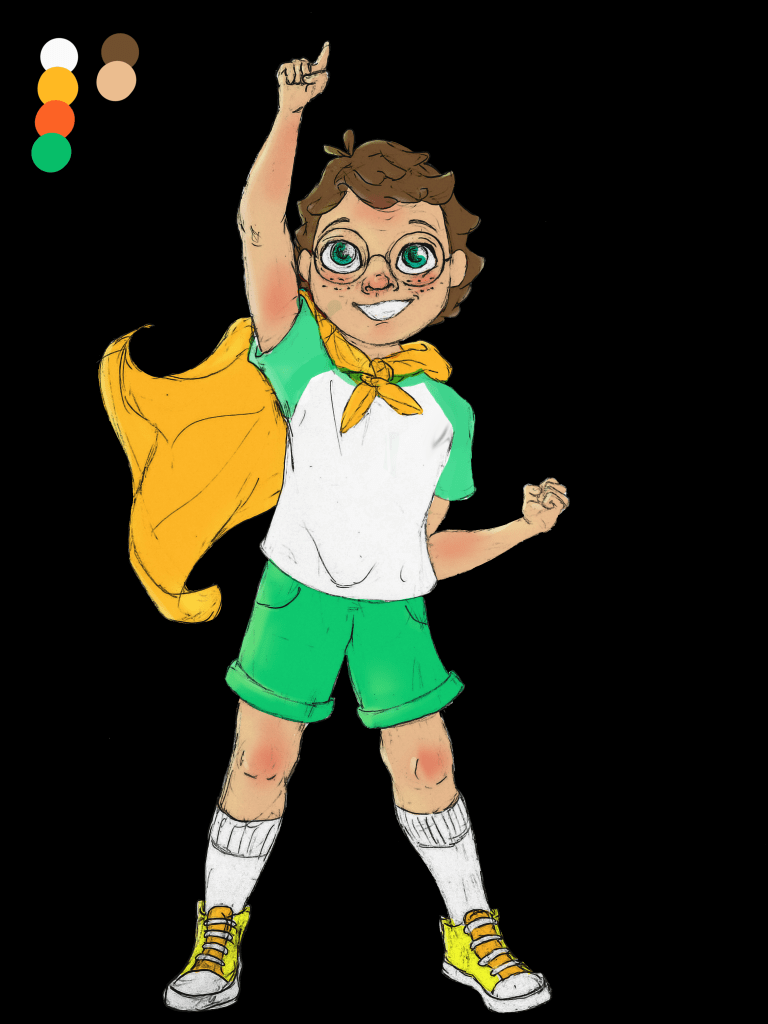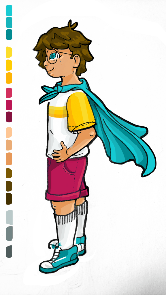 This is the crew! …or backpack gang? Traveling trio? Comment your name ideas below! Notice how they all have all distinct and different features, yet put in the same picture together, they are all somehow cohesive. How do I do this? First: take note of all attributes from the colors and shapes of the hair, skin, facial structure, and eyes… to the type of shirt, length/style of pants, type of shoes, and type of carrying bag(my real life brother David suggested this. I LOVED that idea, for it’s another opportunity to show their unique characteristics). Point being, NOTHING is ever the same! Second: fun fact, my inspiration for when creating this ‘gang’ of characters come from some of my favorite TV shows of all time: Scooby Doo and the MLP: Friendship is Magic. In both shows, although the main crew of characters all have distinct and different features (such as I listed above), what brings them together is that all their designs as a whole include every color of the rainbow! Individually, everyone has their own distinct colors… often two that are analogous or complementary on the color wheel. Lastly: All colors repeat at least twice whether that be in their own design or it appearing on another characters. Such as Shaggy’s shirt and Daphnie’s scarf, Velma’s shirt and Fred’s scarf. Or Pinkie Pie’s skin is the same color as Fluttershy’s hair, Fluttershy’s skin is Apple Jack’s hair. AH! SO COOL! Go look up and find all the color doubles for yourself, this is just scratching the surface! Learn from the greats, study them, and your work will be better too! For my work, I did the rainbow thing and color doubles rule within the individual characters. Can you spot it?