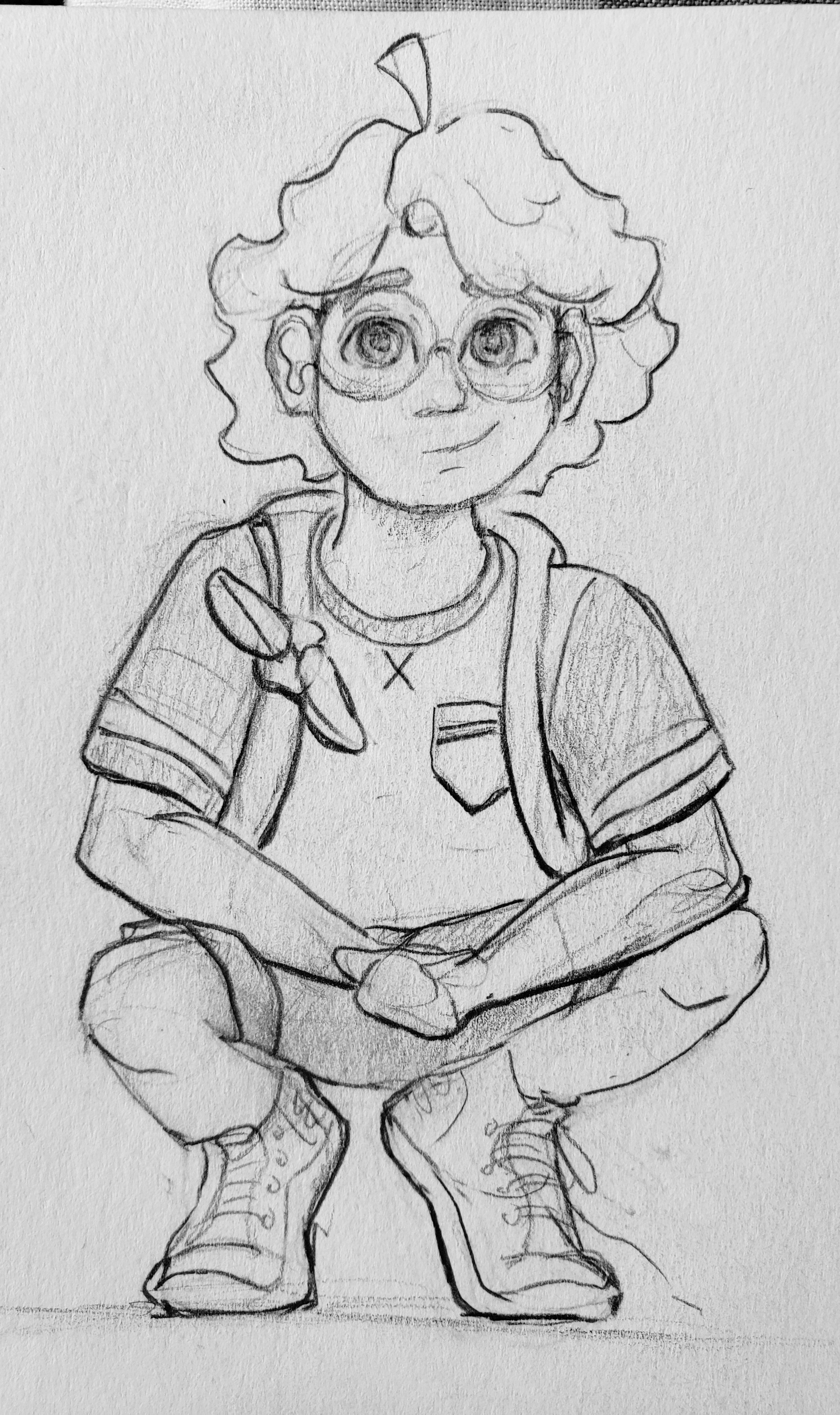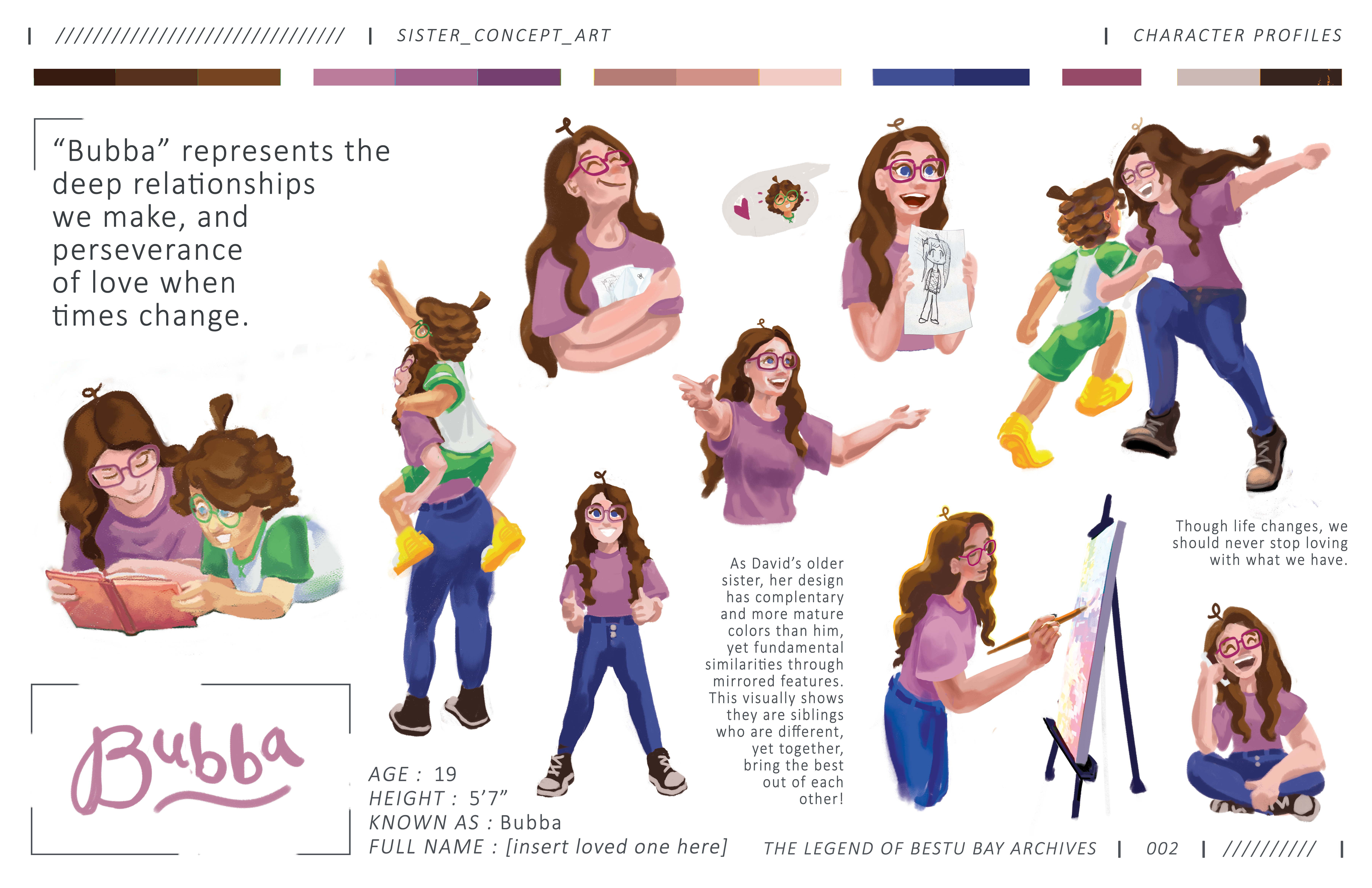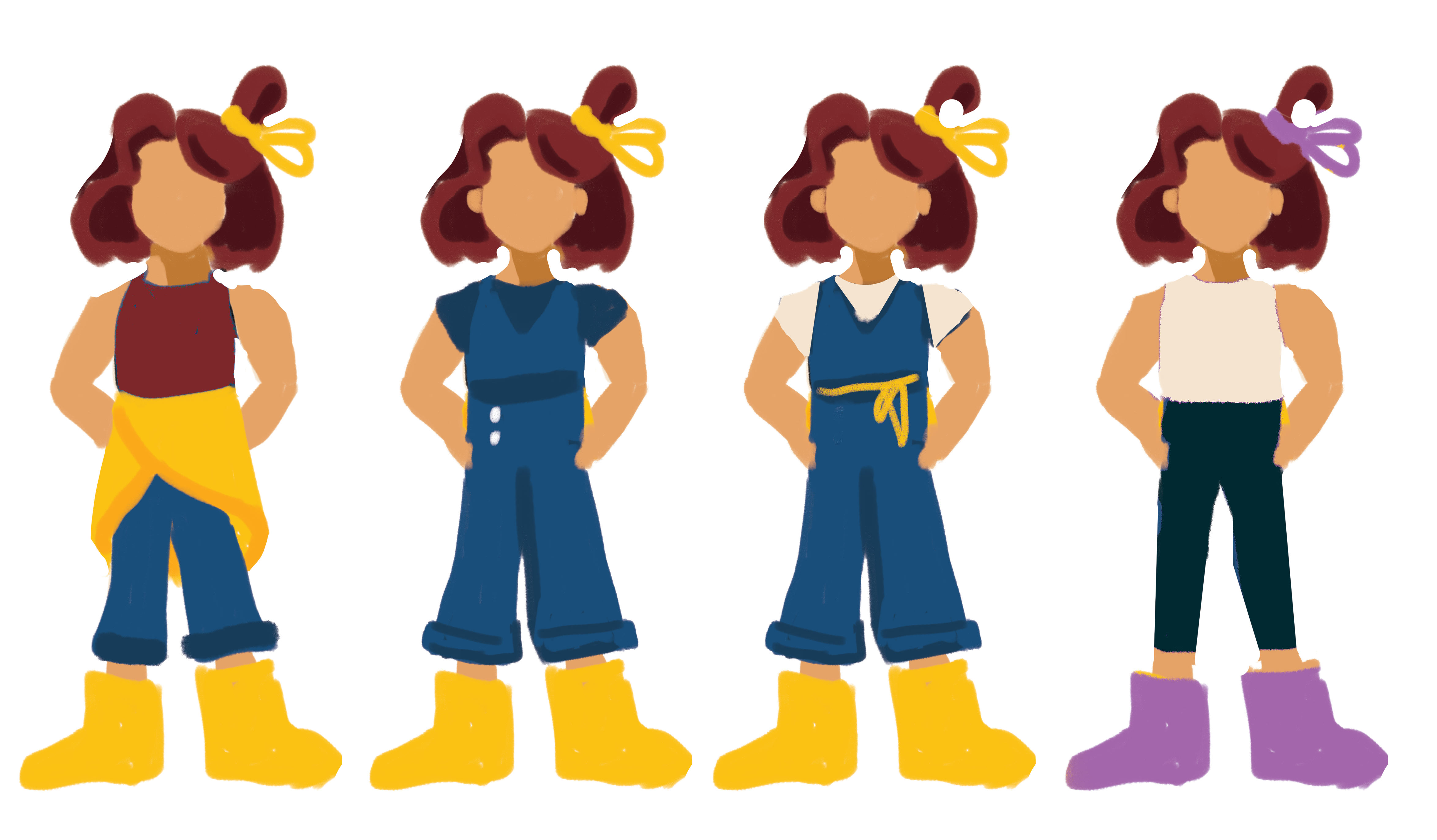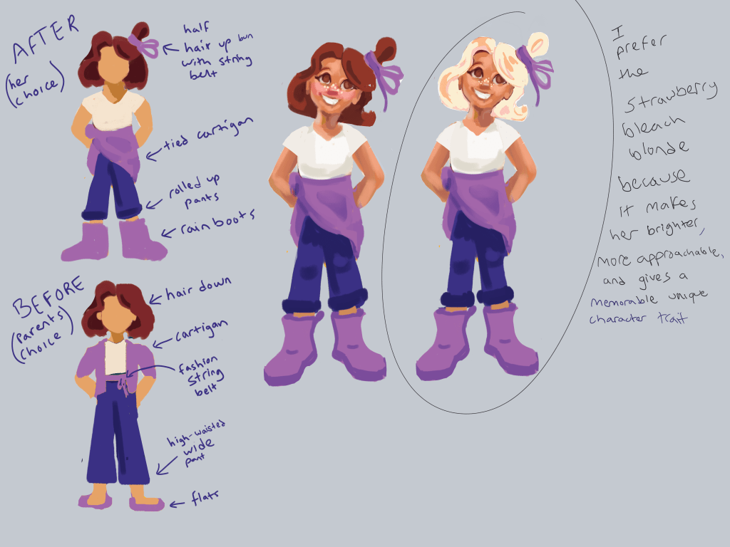 Let me explain. Being that her father is the mayor of the town, her parents expect her to wear nice things so it reflects better on themselves. So her wardrobe is full of expensive threads that are fashionable yet blank clothes without any personality. She’s not ungrateful for what she is given, however her parents never stopped to consider what she wants, what best reflects herself rather than their own public image. She’s not the dainty fragile little girl who sits and has tea parties all day that her parents expect her to be; she the type who loves to explore and meet new people, often has blisters from climbing trees, roller-skates through mud puddles, goes to the dog park to run around with them. It’s only reasonable that such strong and active young lady would prefer to have her hair up out of the way and breathable clothing that doesn’t restrict her for such activities. She also doesn’t want her clothing to make her seem like she’s better than everyone else. So she takes any opportunity to express this. For example, the moment she leaves the house and her parents aren’t with her, these are the things that she can quickly change/put on and off on top of what she has on. All that matters is that her parents don’t catch her with it on. But it’s not like she is void of inner turmoil, or ignores her feminine side. She often struggles with self love, being that the image of herself was always determined by others. But she loves to pick flowers, play with her fairy dolls, and more! Purple was the choice of color because it 1- is a color completely unique to that character (like green is to David and pink to Granny), 2- the color represents her main character quality: faith.