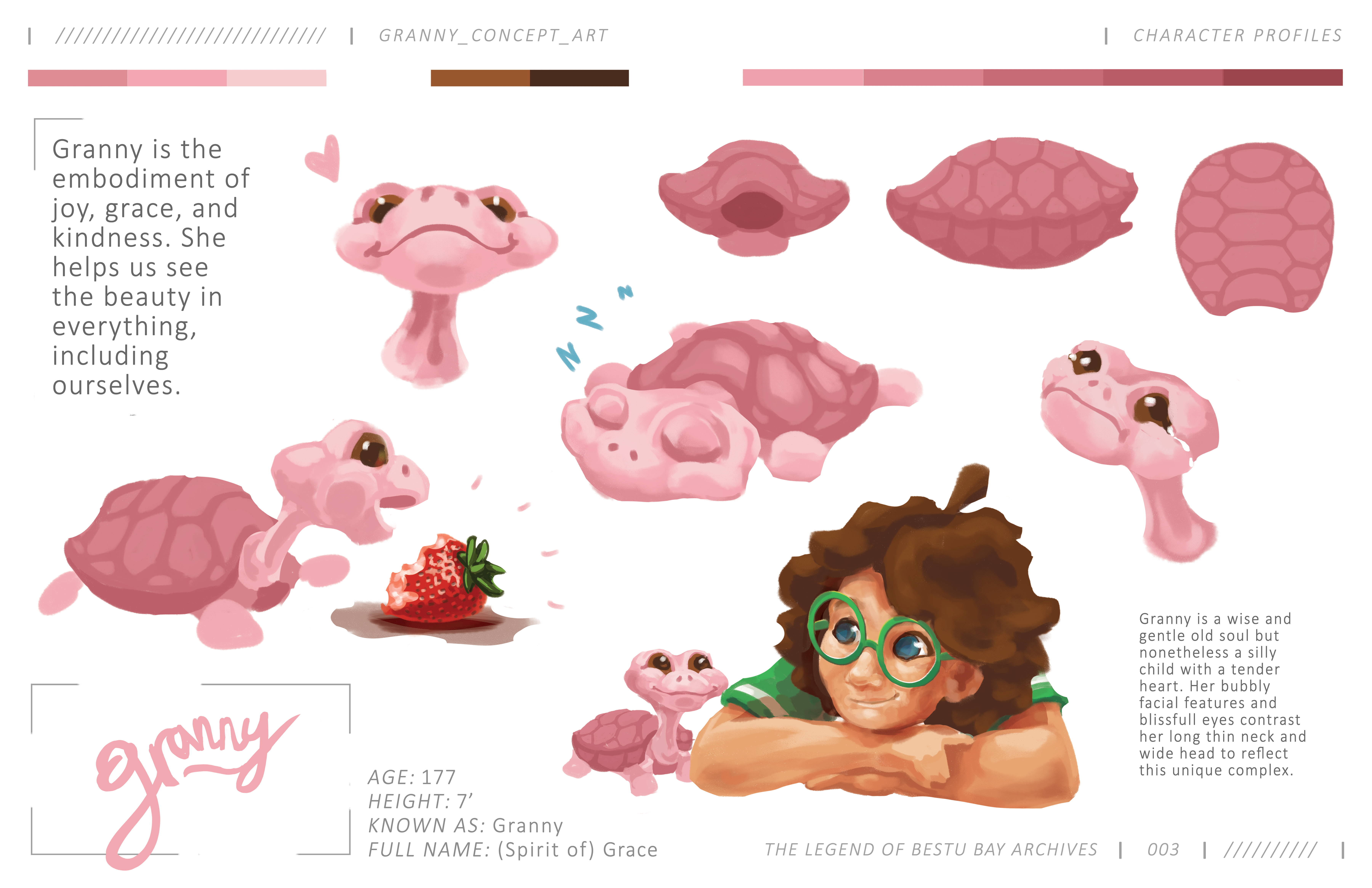 I’m beyond excited to reveal Granny’s official concept sheet above. I’m so so pleased with the final result after all these years! Just like David’s development, I think it’s so cool how you can visually see improvement of my technical abilities not only only in style but also my confidence in drawing her from complex angles with distinct expressions. My favorite part of her design besides those blissful eyes is her long frail neck. It tells us that she is an old lady, but it doesn’t take away from her cuteness! You’ll notice that the final version is somewhat a combination of the first two designs. It’s hard to explain but the one made in 2019 moreso gave off the humble delicate vibes due to the soft smile, all rounded features, and short stubby legs, but it lacked a dynamic, functional, memorable design. The one in 2022 has improved style and practicality compared to her real world counterpart (both the stuffed animal and the Diamondback Terrapin turtle her design is inspired by), however it felt stiff and lifeless (this is partly due to it being a straight up shot, but also because I copy/pasted and mirrored most of it). So taking the best of both worlds, plus my enhanced abilities, it makes for the freakishly loveable, memorable, huggable little gal.